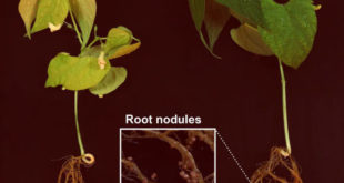 Scientists have discovered an antibiotic produced by a symbiotic nitrogen-fixing bacterium from a tropical forest in Mexico that may help lead to a ‘plant prebiotic.’ Rhizobium sp. forms nodules on bean plant roots, resulting in a more robust plant (right) than on the left. Image credit: Dmitrii Y. Travin. The …