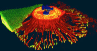 An international research team led by scientists at Karolinska Institutet, Sweden, has discovered a new structure in human cells — a new type of protein complex that the cell uses to attach to its surroundings and proves to play a key part in cell division. 3D projection of a cancer …