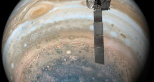 NASA’s Juno spacecraft successfully made its ninth (eighth science) flyby over Jupiter’s mysterious cloud tops on October 24, 2017. This illustration depicts Juno soaring over the south pole of Jupiter. Image credit: NASA / JPL-Caltech. “Data returned October 31 indicate that Juno completed its eighth science flyby over Jupiter’s cloud …