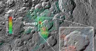 Organic-rich materials found on Ceres by NASA’s Dawn orbiter are native to the dwarf planet, according to new research led by Southwest Research Institute planetary researcher Simone Marchi. Dawn data show a region around Ceres’ Ernutet crater where organic concentrations have been discovered; the color coding shows the surface concentration …