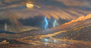 Observations from NASA’s Cassini spacecraft provide evidence of rainfall on the north pole of Saturn’s moon Titan. The rainfall would be the first indication of the start of a summer season in the northern hemisphere of the hazy moon. It’s raining on Titan. Image credit: David A. Hardy, AstroArt / …