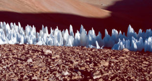 Fields of sharp ice growing to almost 50 feet (15 m) tall could be scattered across the equatorial regions of Jupiter’s moon Europa, according to a new study published in the journal Nature Geoscience. Terrestrial penitentes from the southern end of the Chajnantor plain, Chile, in 2005; the view is …