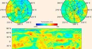 Using data from NASA’s Cassini spacecraft, a team of planetary researchers led by Cornell University has produced a new global topographic map of Titan, the largest moon of Saturn. Top: stereographic polar projections of Titan’s topography with the South Pole left and the North Pole right; Ontario Lacus and the …