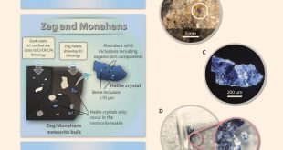 A team of researchers from the United States, UK and Japan has found liquid water and a mix of complex organic compounds in 4.5-billion-year-old salt crystals preserved in two unique meteorites, Zag and Monahans, which separately crashed to Earth in 1998. Zag/Monahans meteorites and their salt (halite) crystals: (A) diagram …