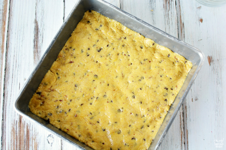 Using a cake mix for your base results in moist and chewy cookie bars. It also eliminates the need to measure out more ingredients.