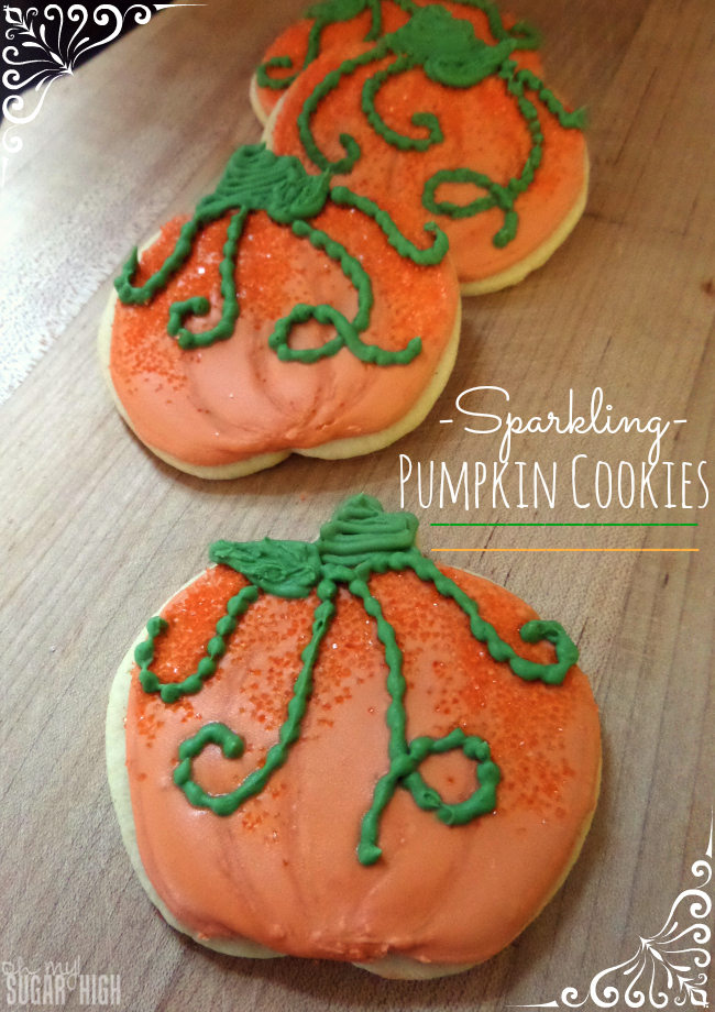 While the icing is still very wet, sprinkle a small amount of orange sugar crystals over the top part of the pumpkin. You can cover as much or as little as you’d like. I wanted just a little shimmer on the tops of the pumpkins.