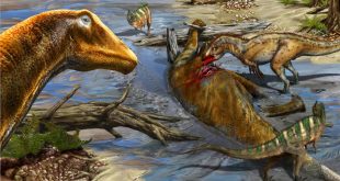 A new species of sauropod dinosaur that lived about 152 million years ago (Jurassic period) has been identified from fossils found in Wyoming. Galeamopus pabsti in its environment in the Late Jurassic of North America. An Allosaurus and two Ceratosaurus are feeding on a carcass of Galeamopus pabsti. Image credit: …